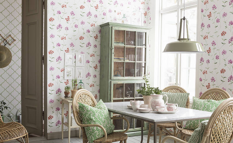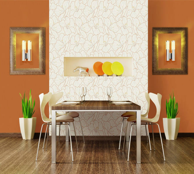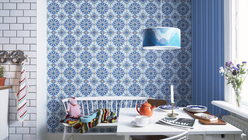 Im Essbereich können Sie beispielsweise ein großes Muster verwenden, das farblich mit einer anderen Wanddekoration übereinstimmt.