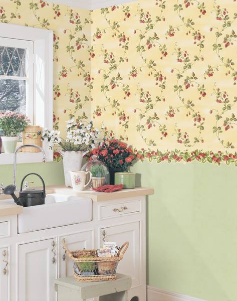 In diesem Fall schützt die aufgetragene Farbbeschichtung das Papier zuverlässig vor Feuchtigkeit, und die Farbe selbst wird häufig nass gewaschen, ohne ihr Aussehen zu verlieren. In jedem Fall ist es ratsam, solche Tapeten außerhalb des Arbeitsbereichs der Küche zu verwenden - Herd und Schneidetisch. Sie können im Essbereich geklebt werden.