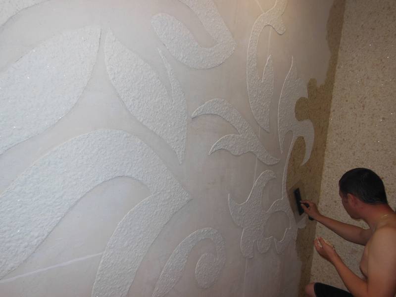 - Das Material wird wie Zierputz mit einem Spatel auf die Wand aufgetragen. Sie können eine kleine Menge Material in die Hand nehmen und an der Wand befestigen und dann mit einem Werkzeug glätten oder eine Komposition mit einem Spatel eingeben. Die Schichtdicke sollte 3 mm nicht überschreiten;