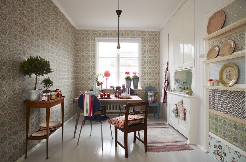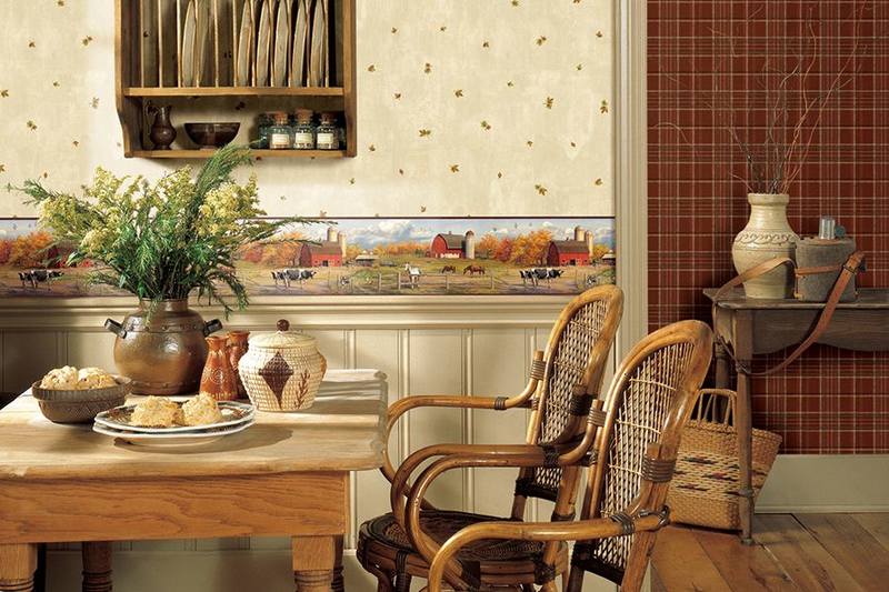 Versuchen Sie nicht, in einer kleinen Küche ein Interieur im antiken oder klassischen Stil einzurichten. Küchen, die mit Tapeten mit einem kleinen, niedlichen englischen Muster oder im Provence-Stil dekoriert sind, werden mit Rändern mit rustikalen Motiven harmonischer aussehen. Sie können auch mit zarten Pastelltapeten über die Wände der Küche kleben und die Wand über dem Esstisch mit einer Fotocollage dekorieren.