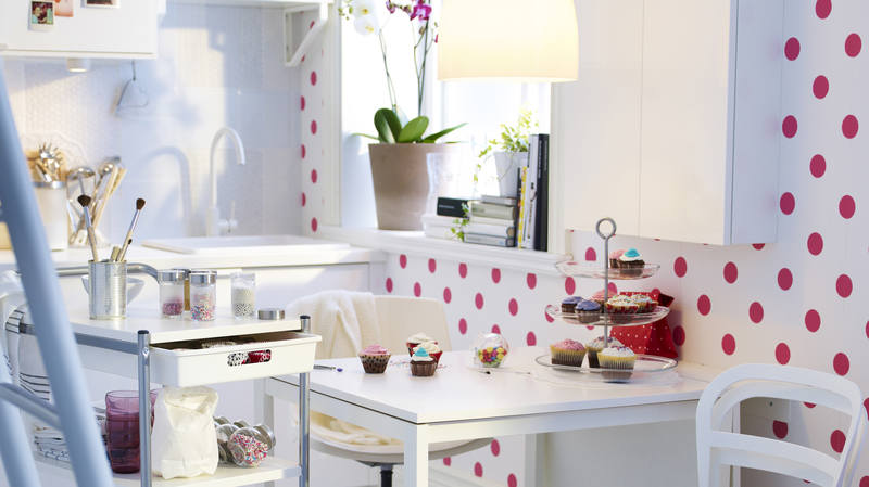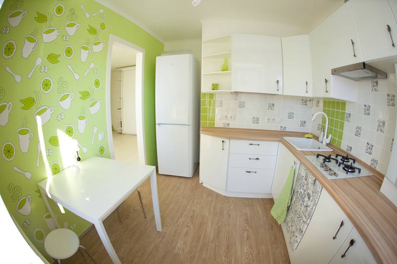 - Feste helle Tapeten vergrößern optisch den kleinen Raum der Küche;