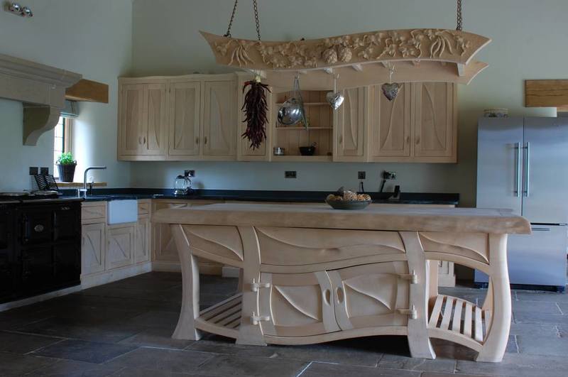 Wie besetzt man eine freie Wand in einer Küche mit flüssiger Tapete? Alternativ können dies dekorative Regale sein, die in der Küche niemals überflüssig werden.