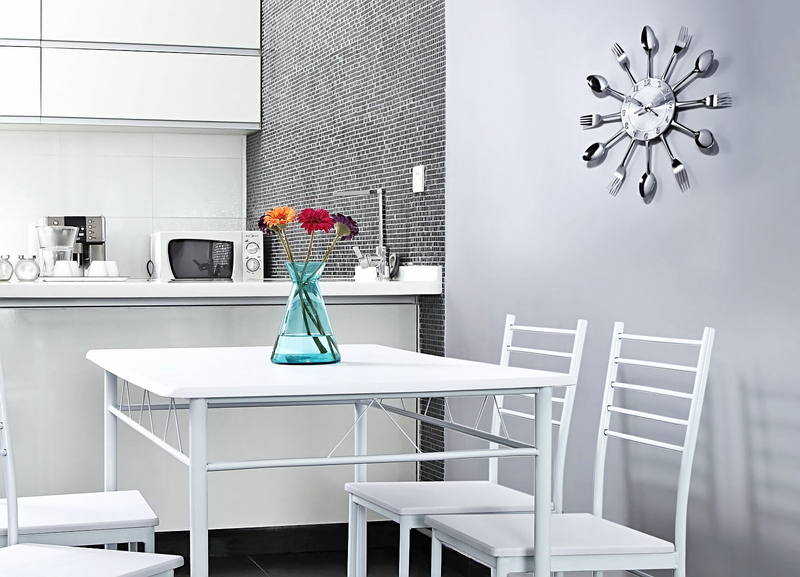 Vergessen Sie nicht die Dekorelemente an den freien Wänden der Küche. Was in der Küche an die Wand hängen? Zum Beispiel: eine dekorative Uhr, die zu einem Schmuckstück und zu einem unverzichtbaren Assistenten in der Küche wird.