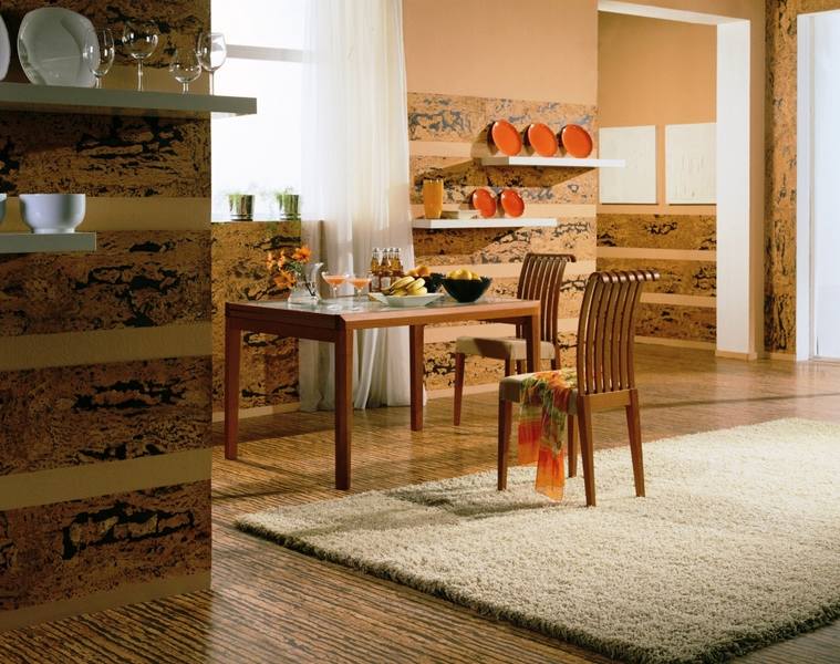 Dies ist eine natürliche Art von Tapete, die auf gepresstem Kork basiert. Erhältlich in Form von Platten, die an die Wand geklebt und lackiert werden.