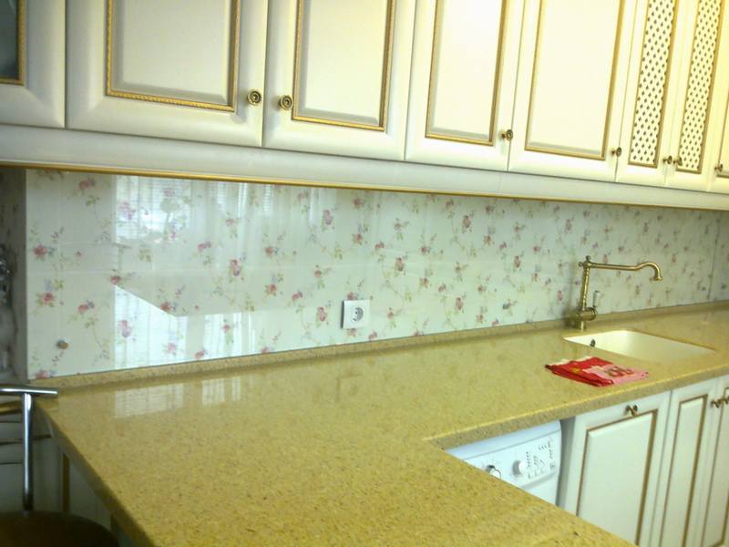 Wandflächen, insbesondere in der Nähe von Kochfeldoberflächen, sollten leicht zu waschen sein, ohne zu verderben. Es ist auch sehr gut, dass das Material neu dekoriert werden konnte.