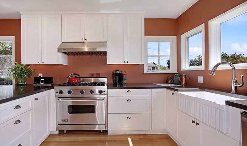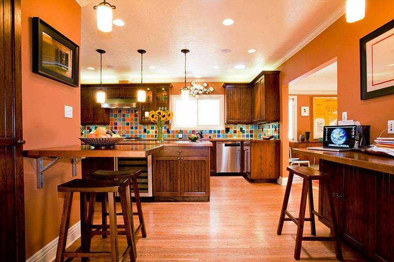 - Traditionelle Farben für die Küche sind Beige, Gelb, Orange. Braune Wände in der Küche passen gut zu einem goldenen Farbton.