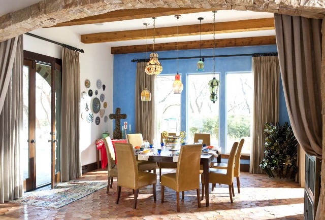 - Ein wesentlicher Bestandteil dieses Entwurfs sind die Deckenbalken. Wenn das Design des Hauses es zulässt, bleiben die Stützbalken in Sicht und schmücken ihre Oberfläche.