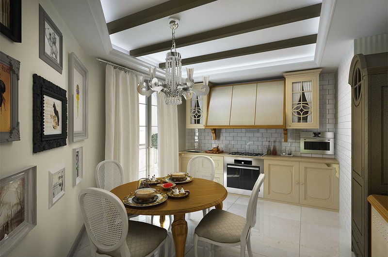 Es gibt viel mehr Möglichkeiten, eine Küche in einem Herrenhaus fertigzustellen als in mehrstöckigen Gebäuden. Dies wird durch eine ausreichende Höhe der Räumlichkeiten und der Fläche der Räume begünstigt.