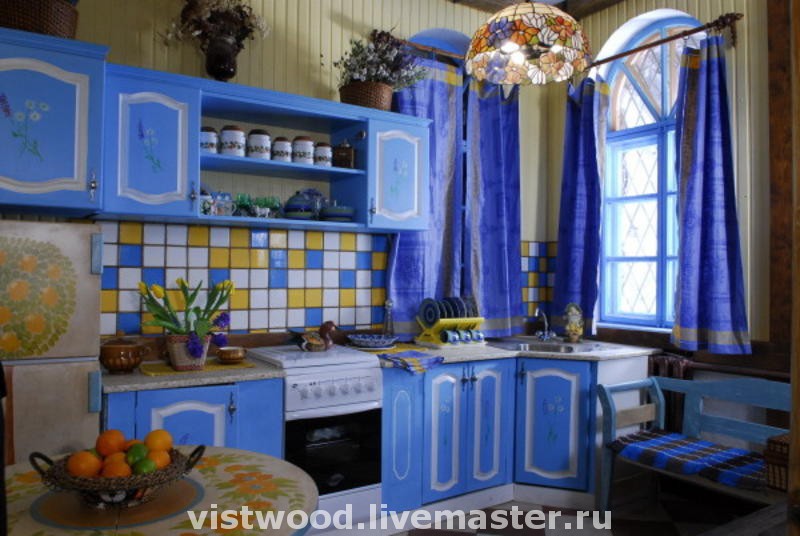 In unserem Beispiel ist die Dekoration der Küche im Landhaus genau das, was getan wurde. Separate Fliesen an der Arbeitswand und hellblaue Vorhänge in der Farbe des Headsets vervollständigen den Innenraum und machen ihn ungewöhnlich attraktiv.