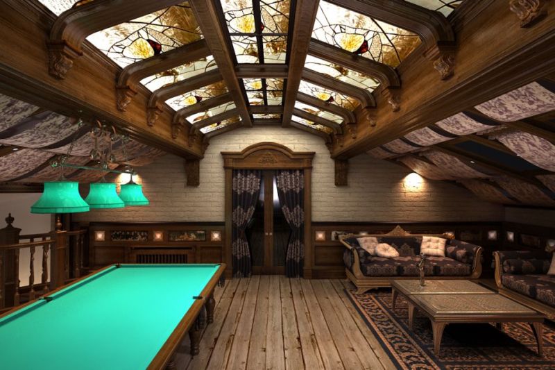 - Genau so ist der Billardraum eingerichtet: ein einfacher Dielenboden, bemaltes Mauerwerk und eine Decke von außergewöhnlicher Schönheit. Und da es sich um den Loft-Stil handelt, finden Sie hier ein weiteres Beispiel für die Dekoration - eines, das ohne die Teilnahme eines Designers möglich ist.