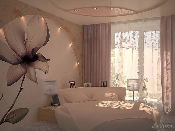 Die eben erwähnten dekorativen Nischen werden am häufigsten im Schlafzimmer am Kopfende des Bettes aufgeführt. - Oft sind solche Nischen mit Fototapeten dekoriert: gewöhnlich oder mit einem 3D-Effekt. Das ist sehr schön, und unser nächstes Beispiel beweist eloquent die Wahrheit dieser Worte.