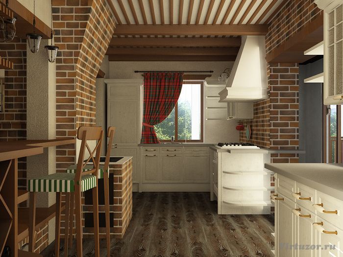 In diesem Fall ist die Decke nicht gestrichen.Es kann jedoch vollständig mit heller Farbe gestrichen oder die Balken im Kontrast hervorgehoben werden - die Optionen können unterschiedlich sein.
