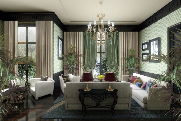- Am unteren Umfang sind schwarze Paneele angebracht, und breite Deckenleisten passen zu ihrem Farbton. Hohe Fenster auf dem Boden und viele Zimmerpflanzen in Verbindung mit dieser Wanddekoration verleihen dem Interieur den Stil der Provence.