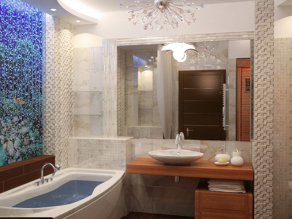 Dies ist ein Innenmaterial, das sehr schön ist und sowohl zur Dekoration von Wohngebäuden als auch in verschiedenen öffentlichen und Verwaltungsgebäuden verwendet wird. - Dementsprechend kann der Hersteller zur Fertigstellung eines großen Objekts eine Einzelbestellung mit nicht standardmäßigen Plattengrößen aufgeben. Auf dem Bild unten können Sie das Design des Badezimmers mit GMD bewerten. Gipsplatten können übrigens nicht nur für Wände, sondern auch für Decken verwendet werden.
