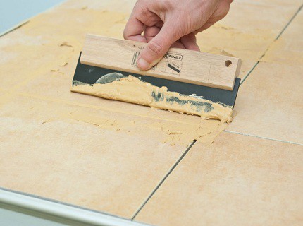 - Nach dem Verlegen der Fliesen werden Kunststoffkreuze von den Nähten entfernt, die Fugen der Fliesen mit einem Gummispatel abgerieben.