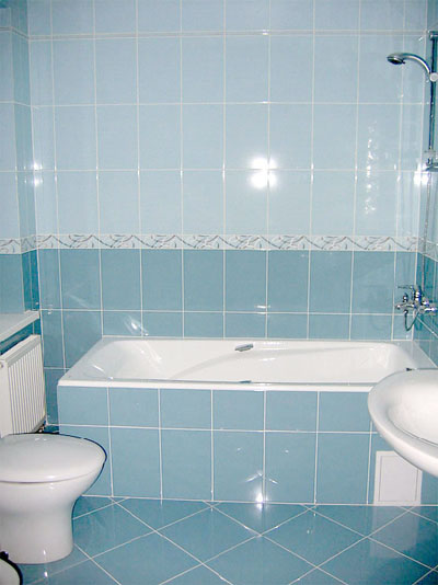 - Oft gibt es eine Kombination aus Blau und Hellblau in Kombination mit großen weißen Fliesen. Jeder Farbumfang wird interessant und reichhaltig aussehen, aber Sie müssen ihn nicht mit vielen Farben und Schattierungen übertreiben.