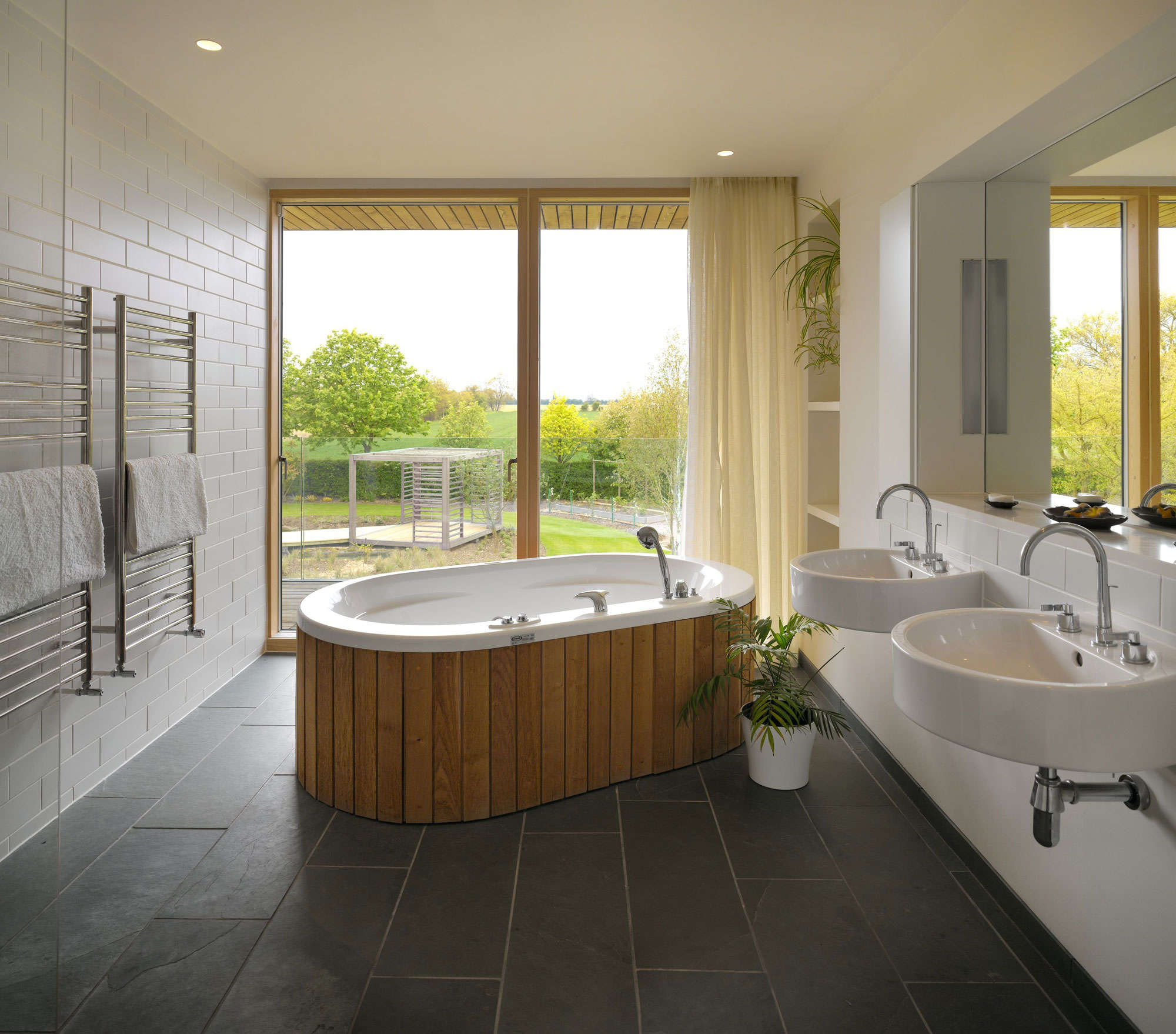 In Privathäusern, in denen die Fläche der Badezimmer nicht kleiner als die Fläche der Küche oder des Schlafzimmers ist und oft sogar Fenster haben, ist das Problem der hohen Luftfeuchtigkeit nicht so akut wie in Wohnungen. Wenn die Holzkonstruktionen richtig behandelt werden, schadet ihnen Dampf nicht - insbesondere wenn der Raum belüftet werden kann.