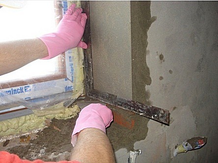 - Zunächst wird die erste Schicht der Stuckmischung (Start), die große Körner aufweist, auf die Oberfläche des Abhangs aufgetragen. Mit seiner Hilfe wird die Oberfläche geebnet. Es lohnt sich auch, spezielle Metallecken für ebene Hänge zu verwenden.