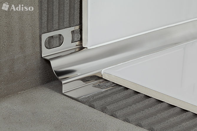 - Για το σκοπό αυτό, μπορείτε να αγοράσετε εδώ ένα τέτοιο προφίλ από πλαστικό ή ανοξείδωτο ατσάλι, το οποίο βλέπετε στη φωτογραφία. Δεν στερεώνει μόνο το πλακίδιο, αλλά και διακοσμεί τους γωνιακούς αρμούς. Επομένως, σε αντίθεση με τη γραμμή εκκίνησης, δεν θα χρειαστεί να την αποσυναρμολογήσετε.