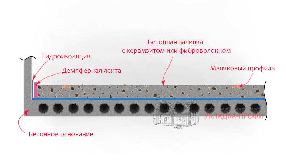 - Ο πρώτος. Μια βάση από σκυρόδεμα μπορεί να κατασκευαστεί χρησιμοποιώντας χοντρόκοκκο διογκωμένο πηλό ή ίνες πολυμερούς ως πληρωτικό. Σε αυτήν την περίπτωση, εκτός από τη στεγανοποίηση αρμών, το δάπεδο πρέπει να στεγανοποιείται σε ολόκληρη την περιοχή - για παράδειγμα, είναι δυνατόν να τοποθετηθεί πολυαιθυλένιο. Στη συνέχεια εγκαθίστανται οι φάροι, γεμίζεται το πληρωτικό και όλα αυτά χύνονται με τσιμεντοκονίαμα υγρής συνοχής.