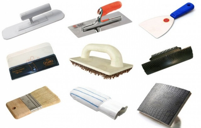 - Όταν χρησιμοποιείτε τσιμεντοκονία, προετοιμάστε επιπλέον τρίφτη και τρίφτη. Και για εργασία με γύψο - τρίφτη με σπογγώδη βάση, σπάτουλα πλάτους 45 cm και λείανση λείανσης για στίλβωση μεγάλων και μικρών μεγεθών.