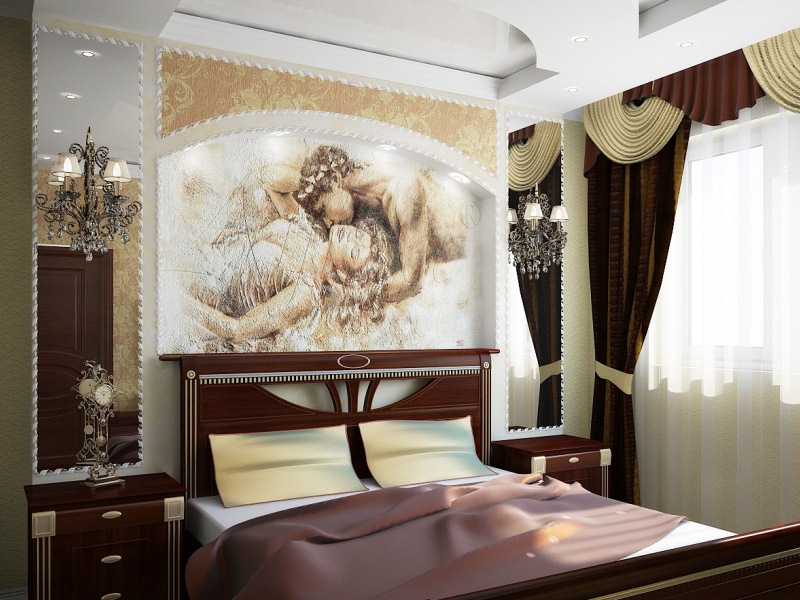 Η τοιχογραφία στην κρεβατοκάμαρα είναι ένα αρκετά δημοφιλές φαινόμενο, καθώς και η ταπετσαρία φωτογραφιών (βλΦωτο-χαρτί σε ένα εσωτερικό υπνοδωμάτιο: πώς να επιλέξετε σωστά) Τις περισσότερες φορές, εικόνες από ρομαντικές σκηνές, έναστρο ουρανό και όλα τα γαλήνια τοπία επιλέγονται σε αυτό το δωμάτιο. Δεν πρέπει να χρησιμοποιείτε πολλές λεπτομέρειες όταν βάφετε τους τοίχους ενός υπνοδωματίου, επειδή αυτό μπορεί να οδηγήσει στο αντίθετο αποτέλεσμα - στον ερεθισμό.