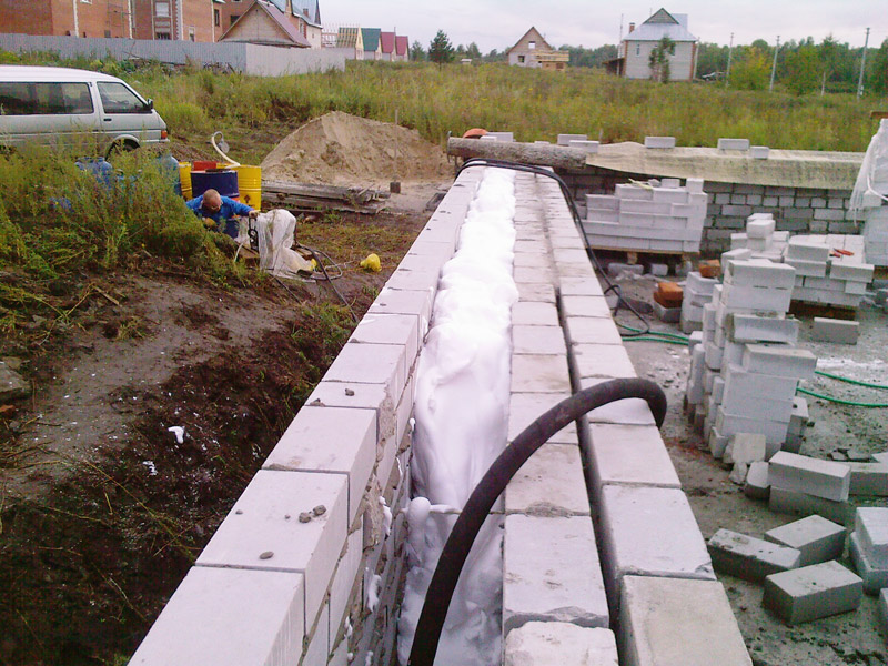 Εάν τα φρεάτια γεμίζουν με σκυρόδεμα ή αφρό, τότε συνήθως σε κάθε πέμπτη σειρά τακτοποιούν την απελευθέρωση των γραμμών βελονιών, οι οποίες θα πρέπει να παίζουν το ρόλο των αγκυρίων.Κατά τη χρήση χύδην υλικών, οι τοίχοι συνδέονται με λωρίδες από χάλυβα λεπτού πλέγματος, το οποίο όχι μόνο παρέχει μια άκαμπτη στερέωση των τοίχων, αλλά επίσης δεν επιτρέπει στη μόνωση να καθιζάνει και να απομακρυνθεί κάτω, αφήνοντας κενά στην κορυφή.