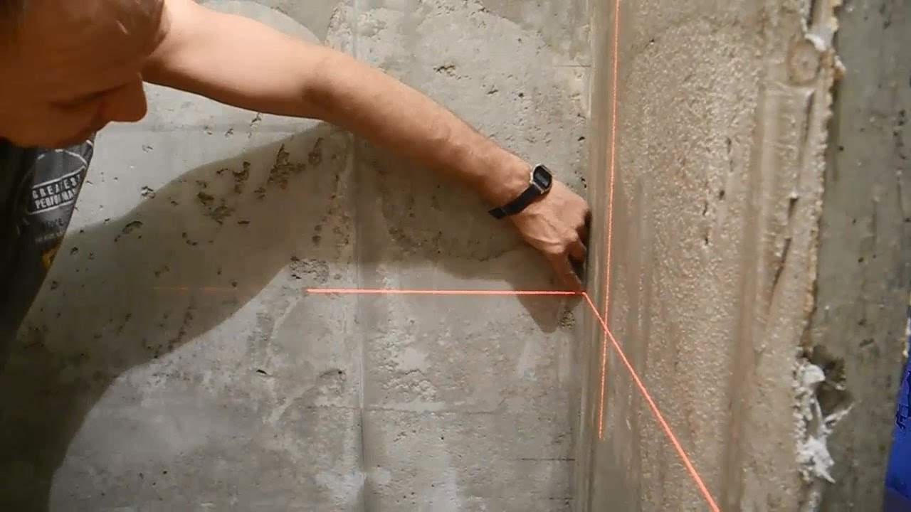 - Πρώτον, οι τοίχοι είναι κρεμασμένοι υδραυλικό Οι αποκλίσεις στο επίπεδο της βάσης κατά την τοποθέτηση των πλακιδίων στο κονίαμα δεν πρέπει να υπερβαίνουν τα 15 mm. Διαφορετικά, η επιφάνεια πρέπει να ισοπεδωθεί. Δεν είναι απαραίτητο να εξομαλύνετε και να αλέσετε το τσιμέντο. Οι επιφάνειες από σκυρόδεμα προεγγράφονται με σφυρί ή πνευματικό σφυρί.