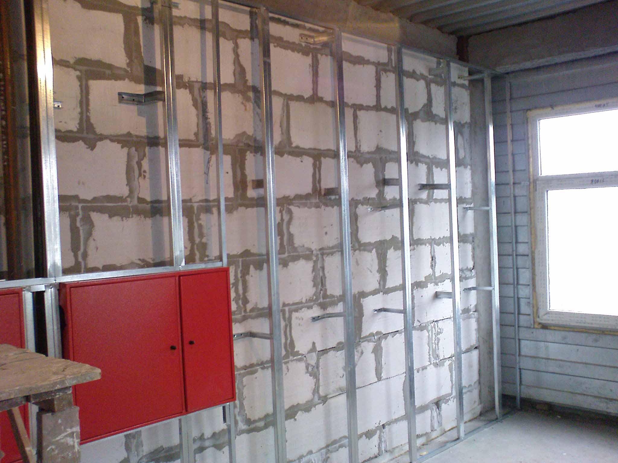 - Εάν τα τοιχώματα είναι ομοιόμορφα, το προφίλ στήριξης μπορεί να τοποθετηθεί πίσω από ένα ράφι, απευθείας στην επιφάνειά τους. Διαφορετικά, για να ισοπεδώσετε το επίπεδο πρέπει να χρησιμοποιήσετε άμεσες αναστολές. Το βήμα μεταξύ των ορθοστατών συνήθως δεν υπερβαίνει τα 1,2 m, συν το πλάτος του προφίλ ωμέγα, συνήθως αντιστοιχεί σε 12 mm.