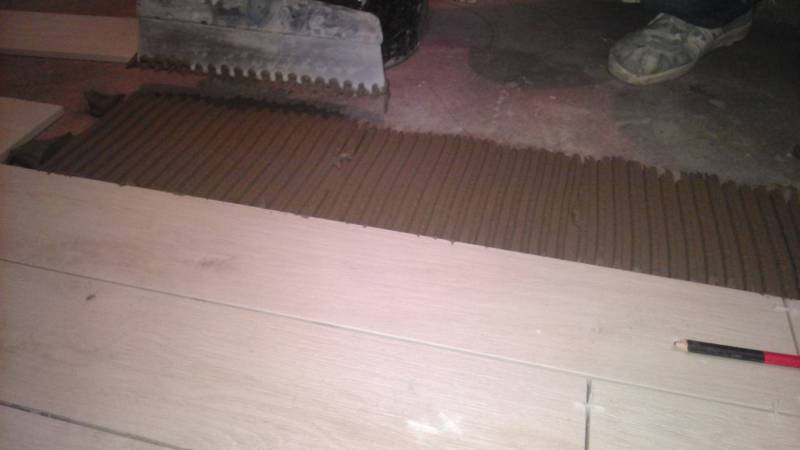 - Τώρα που η κόλλα έχει εφαρμοστεί ομοιόμορφα, πάρτε το πλακίδιο, τοποθετήστε το με μια άκρη στο πάτωμα και αφήστε το δεύτερο από ύψος 5 - 10 εκατοστά. Έχοντας πέσει, προσκολλάται σφιχτά στην κόλλα. Ελέγξτε προσεκτικά τη θέση που καταλαμβάνει το πλακίδιο και διορθώστε το εάν είναι απαραίτητο.