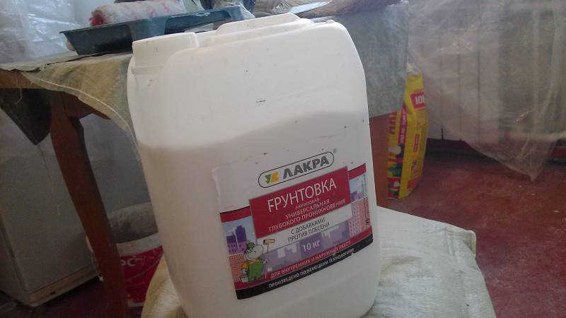 Το επόμενο βήμα είναι να εφαρμόσετε ένα αστάρι. Στην περίπτωσή μας, αγοράστηκε μια σύνθεση βαθιάς διείσδυσης της εταιρείας Lacra, η οποία περιέχει πρόσθετα ελέγχου μούχλας. Αυτό το έδαφος ανήκει στην κατηγορία προϋπολογισμού και η μέση τιμή ανά 10 κιλά κυμαίνεται περίπου 400 ρούβλια. Από τη συνολική μάζα, δεν ξεχωρίζει κάτι ιδιαίτερο και είναι αρκετά καλό για μια επιφάνεια γύψου.