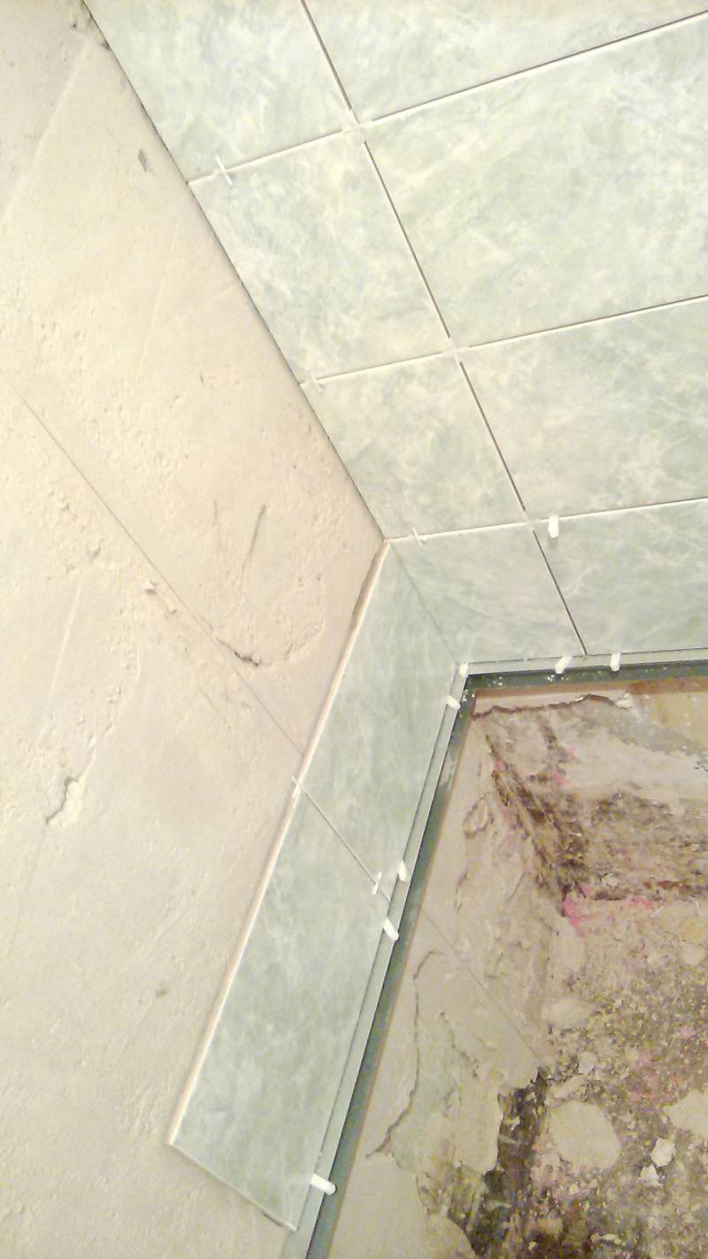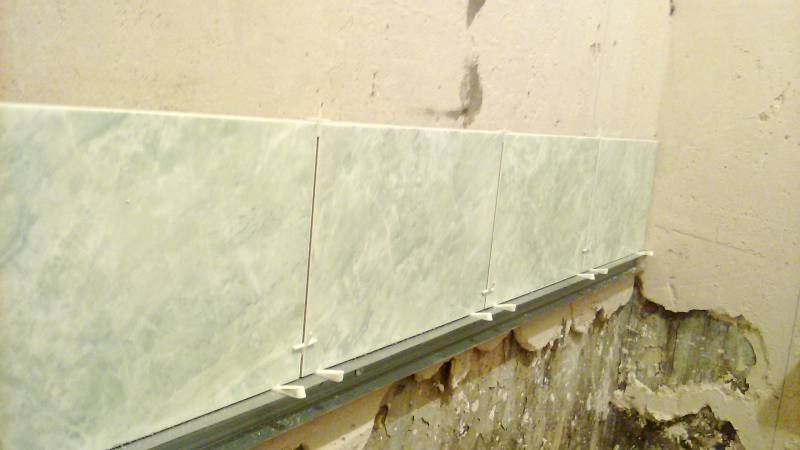 Κατά τη διάρκεια του χρόνου αποκτήσαμε ό, τι χρειαζόμασταν, το αστάρι στέγνωσε και τώρα ο τοίχος είναι εντελώς έτοιμος για εγκατάσταση πλακιδίων. Δεδομένου ότι όλα παραμένουν αμετάβλητα πίσω από το μπάνιο, το πρώτο πράγμα που εγκαθιστούμε είναι το προφίλ μας.Φυσικά, το ίδιο το μπάνιο μπορεί να χρησιμοποιηθεί για αυτούς τους σκοπούς, αλλά στην περίπτωσή μας οι άκρες του αποδείχθηκαν στρογγυλεμένες, εξαιτίας των οποίων η αρχική ραφή έπρεπε να κατεβεί 2 cm χαμηλότερα.