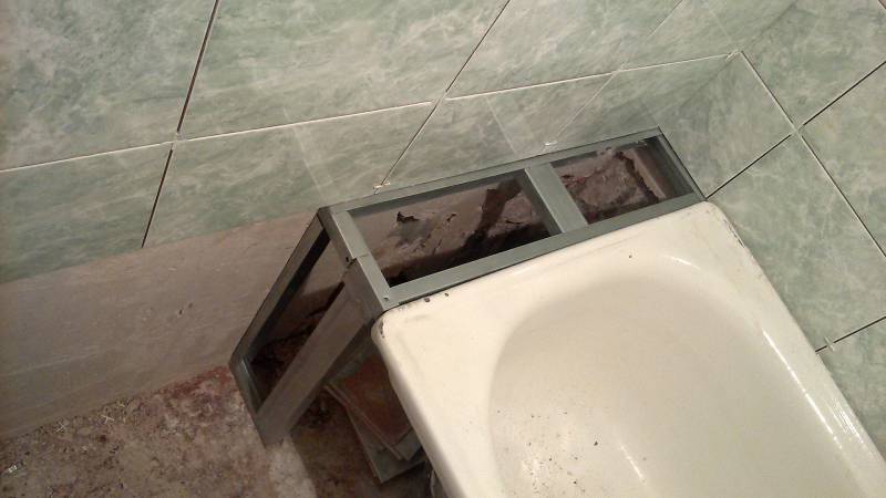 Τώρα, αφού ολοκληρώσουμε το περπάτημα γύρω από την μπανιέρα, μπορούμε να κατεβάσουμε την πρώτη σειρά πιο κοντά στο πάτωμα, αλλά πρώτα θα συλλέξουμε το ήδη αναφερθέν ράφι. Δεν θα δώσουμε μια λεπτομερή περιγραφή της διαδικασίας · θα περιοριστούμε σε μερικές φωτογραφίες.
