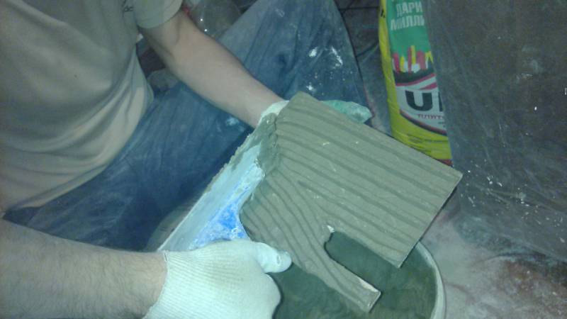 - Απλώστε κόλλα στα πλακάκια ή στον τοίχο - όπως προτιμάτε. Εγκαθιστούμε το πρώτο πλακίδιο σε προκαθορισμένο μέρος και χτυπάμε ελαφρά την παλάμη στην επιφάνειά της για να πιέσουμε ελαφρώς την κόλλα - αυτό θα δημιουργήσει καλύτερη πρόσφυση.