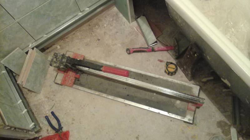Τώρα ας πούμε δύο λέξεις για το εργαλείο με το οποίο κόπηκε το πλακίδιο. Στη δουλειά μας, χρησιμοποιούμε τον κόπτη πλακιδίων Matrix από τη σειρά Professional. Αγοράστηκε προτού πέσει το ρούβλι για 3000. Αντιμετωπίζει σχεδόν κάθε κεραμίδι τέλεια, με εξαίρεση την πορσελάνη.