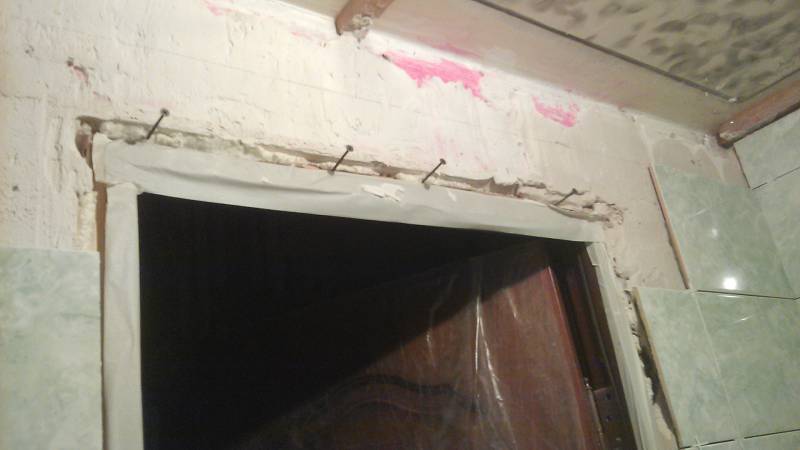 Τώρα, έχοντας μετρήσει την απαιτούμενη απόσταση, μετακινούμε τις στάσεις προς τα κάτω. Η κάτω σειρά των πλακιδίων θα κοπεί στο επίπεδο του δαπέδου, οπότε σε αυτό το στάδιο δεν θα τοποθετηθεί. Αναφέρουμε τα πλαϊνά τοιχώματα και προχωρούμε στο πιο δύσκολο - το φινίρισμα. Το κύριο κλείδωμα είναι να μειώσετε τις οριζόντιες ραφές πάνω από την πόρτα, αλλά εάν η σήμανση γίνει σωστά, τότε δεν θα αφήσετε πολύ χρόνο, απλώς τραβήξτε το νάιλον νήμα μεταξύ τους.
