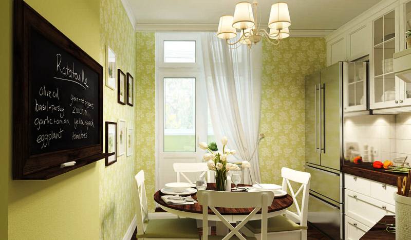 Ταπετσαρίες κουζίνας θα πρέπει να συνδυάζονται με άλλα στοιχεία του εσωτερικού. Οι ελαφριές κουρτίνες, η απαλή υφή και τα συμπαγή χρώματα θα κερδίσουν στο φόντο των τοίχων με καθαρά γεωμετρικά σχήματα ή στολίδι.