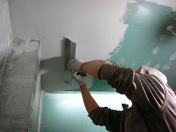- Με ένα μεγάλο μυστρί, στόκος εφαρμόζεται στον τοίχο με ομαλές τοξοειδείς κινήσεις.