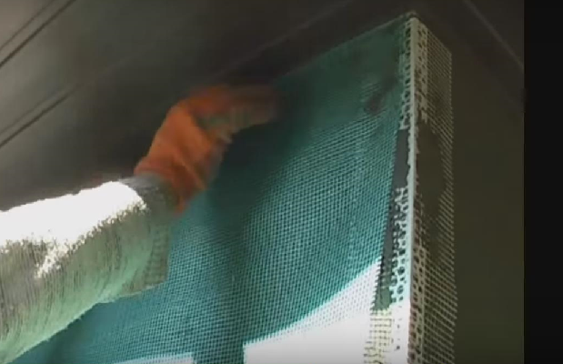 - Μια ταινία από πλέγμα από υαλοβάμβακα είναι κολλημένη, ξεκινώντας από την κορυφή, στον τοίχο και στερεώθηκε ελαφρώς λαμβάνοντας τη λύση στο κάτω μέρος, για αξιοπιστία.