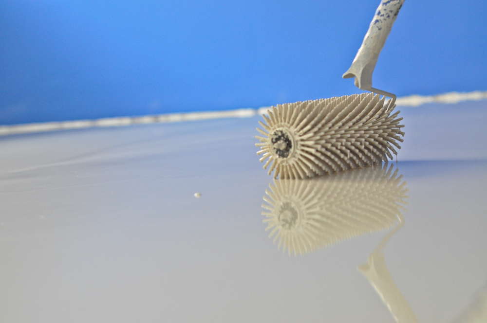 Έχοντας αλείψει το επόμενο τμήμα του μείγματος στην επιφάνεια, ρυθμίστε το πάχος του στρώματος που λαμβάνεται με ένα ελαστικό μάκτρο. Για να απαλλαγείτε από τον παγιδευμένο αέρα, σύρετε αμέσως την επιφάνεια με έναν κύλινδρο βελόνας. Η ίδια σειρά λειτουργιών επαναλαμβάνεται για κάθε νέο τμήμα του διαλύματος έως ότου ολόκληρο το δάπεδο να είναι ένα λεπτό ομοιόμορφο στρώμα έκχυσης.