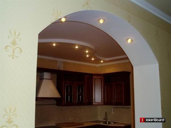 Η απλούστερη επιλογή για την κατασκευή του είναι γυψοσανίδα. - Ο σχεδιασμός του τόξου από γυψοσανίδα σας επιτρέπει να ενσωματώσετε προβολείς σε αυτό, το οποίο θα χρησιμεύσει ως πρόσθετη διακόσμηση και θα τονίσει το κομψό του σχήμα.