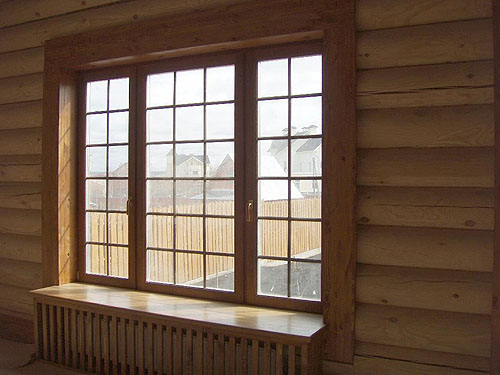 The inner lining of a wall with a window is best done not with a house block, but with a wooden panel. First, vertical bars of the frame are attached to the wall, and then horizontal lamellas of the lining are nailed to them with a spike up. They are fastened with nails in a spike so that the heads of the nails are not visible, because the groove of the next board will close them. After facing the walls, dobers are installed on the slopes around the window perimeter, which will cover the ends of the lining, and then platbands are attached to the lining and dobors.