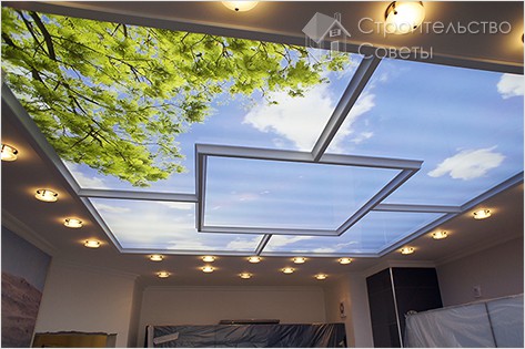 - Ceiling false window. This design has a special appearance on a suspended ceiling. A similar technique is very often used to create an imitation of an open type glass roof. In this case, the arrangement of the “false” window is performed in the following sequence: