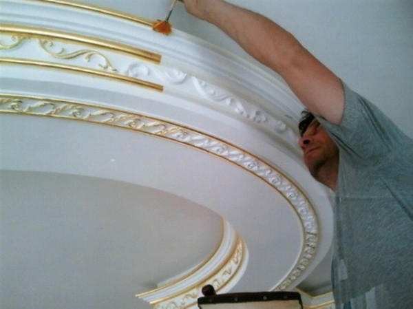 As for the application method, for painting already mounted cornices, you can use both ordinary paint and paint in spray cans. Of course, if the walls and ceiling are not finished yet. Working with it is much more convenient, the result is high-quality, but changing its color will not work.