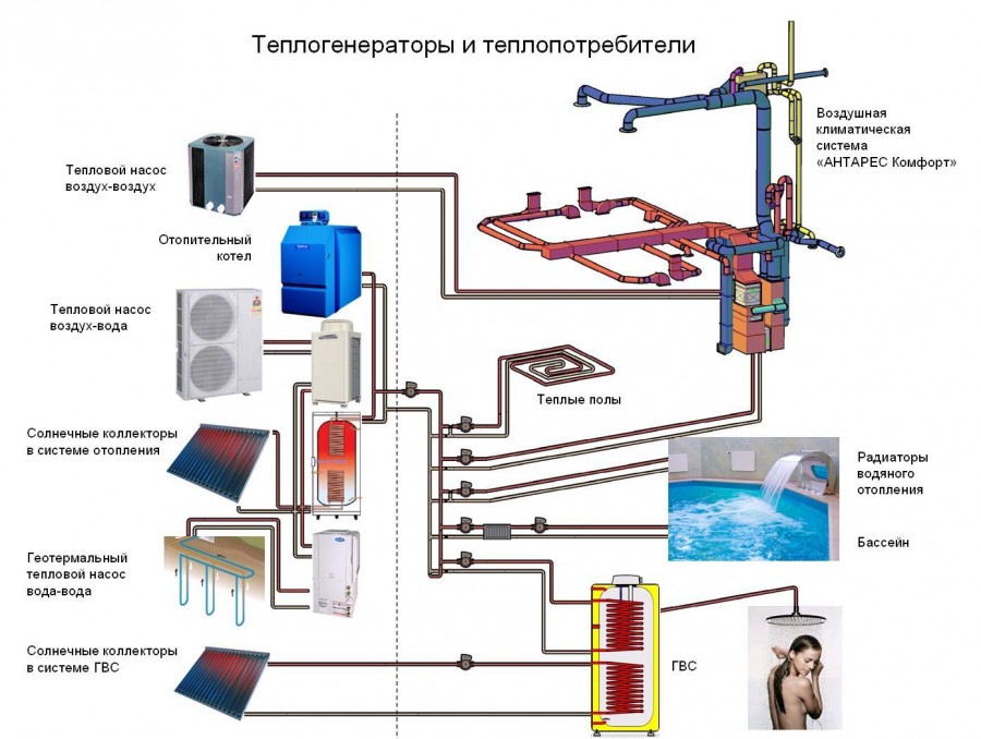 - Hot water is supplied to the house and it is heated according to the “underfloor heating” system by means of a geothermal heat pump, coupled with solar collectors. For clarity, below is a diagram. At critical values of winter temperatures, pre-heating of the coolant is carried out using electric heaters.