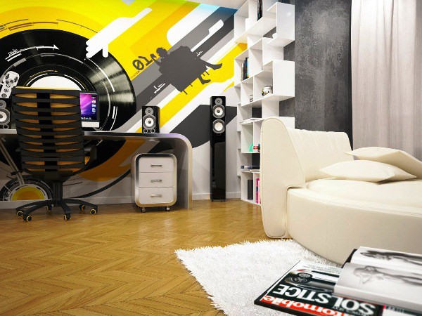 Mural in the room (see How to make your own photo wallpaper: consider in detail), where a teenage boy lives, it is possible to order from prepared drawings, which will allow the child to emphasize his personal style without cluttering up the room.
