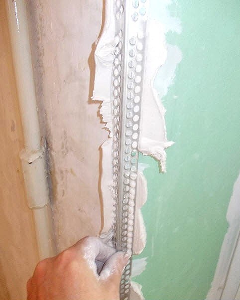 - Glue the perforated corner onto the fresh putty by pressing it into the solution. Correct the vertical and horizontal angles using the level, pushing it deeper into the solution where necessary.