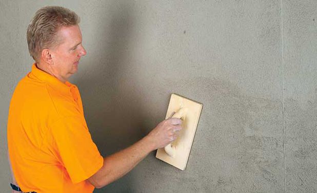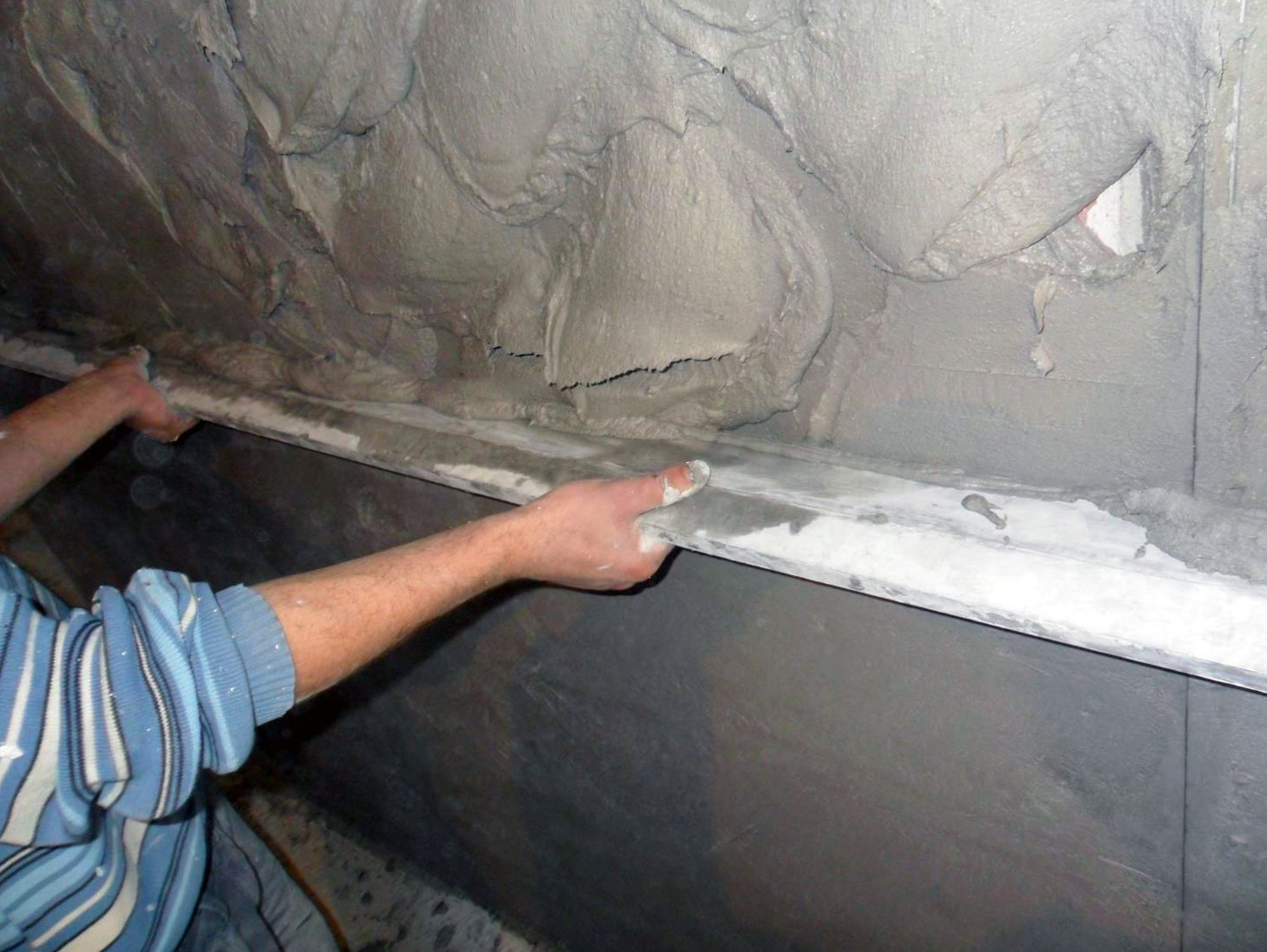 The solution for this stage resembles liquid sour cream in consistency. We pick it up in the bucket and throw it on the wall. It is important to correctly calculate the force: the solution should stick, and not bounce off the wall.