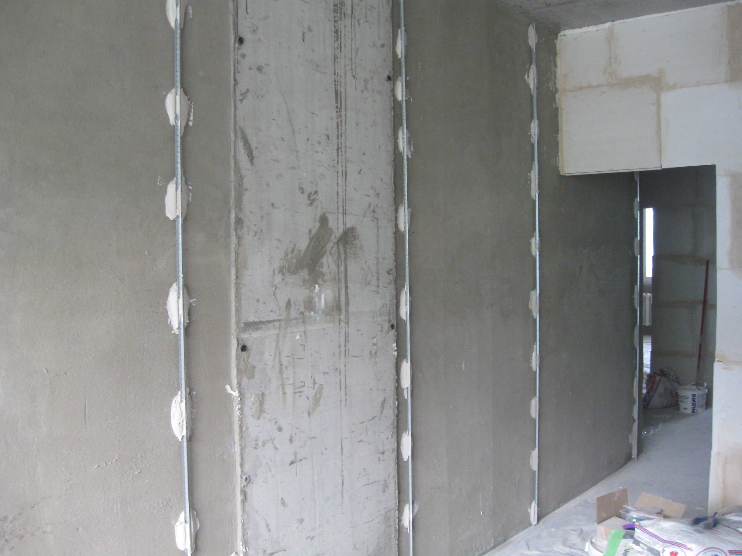 When the strip hardens, it is slightly tapped and removed, and the voids formed in the lighthouses are closed and leveled with a trowel. After applying the second layer of plaster, mortar beacons are cut down, their locations are closed up, checking the flatness of the plane along the way, and eliminating inaccuracies.