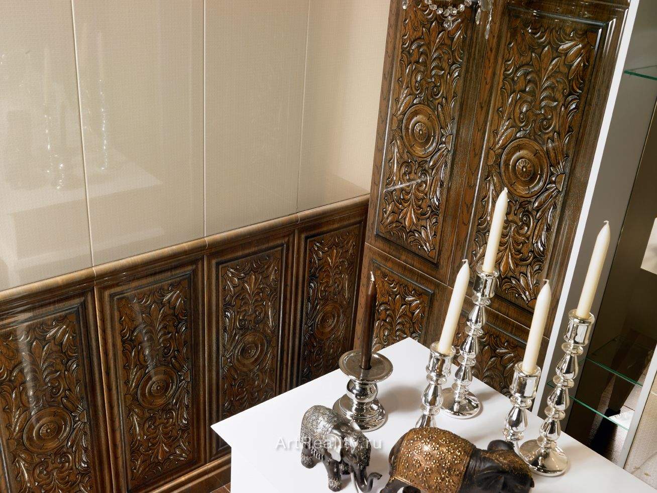 - There are plates with a metallic sheen, and with a craquelure effect, antique. The price of such products is quite high, but beauty, as you know, requires sacrifice. By the way, ceramic panels imitating a brushed parquet board look great as floor coverings in residential premises, even bedrooms.